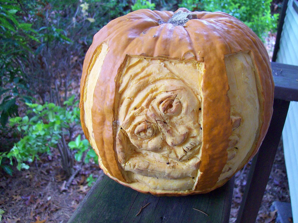 It’s quite dark out already but I’m not seeing any trick-or-treat action on our very quiet, rather safe suburban street. So I don’t think Jack is in that much danger of violent liberation, out on the porch rail where he is now.